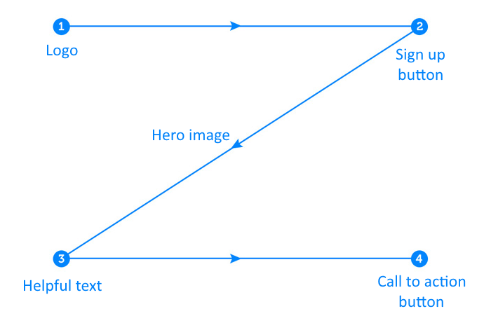 ถ้า F-Pattern จะทำงานได้ดีกับเนื้อหา Z-Pattern ก็จะทำได้ดีในงานประเภทภาพโฆษณา, Landing Page หรือหน้าที่มีปุ่ม Call to Action ที่มีเป้าหมายเดียวชัดเจนคือการกระตุ้นให้เกิด Action ตามทฤษฎีของ Gutenberg Diagram ที่ระบุว่าสายตามนุษย์มีแรงดึงดูดตามธรรมชาติที่จะกวาดจากมุมบนซ้ายลงสู่มุมล่างขวาเสมอครับ