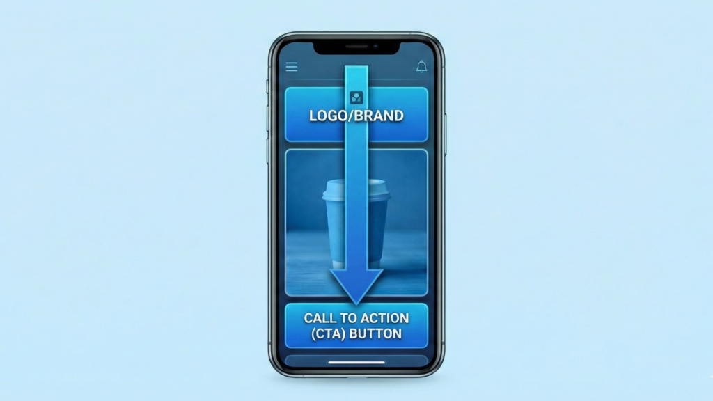 ดังนั้น การออกแบบสำหรับ Mobile First จึงต้องเปลี่ยนวิธีคิดจากการวางองค์ประกอบกระจัดกระจายซ้ายขวา มาเป็นการวางแบบ Stacking หรือเรียงลำดับลงมา โดยให้ความสำคัญกับ จุดกึ่งกลางจอ มากที่สุด เพราะเป็นจุดที่สายตาโฟกัสได้ง่ายที่สุดในขณะที่ถือโทรศัพท์ การจัดวาง Layout อาจจะต้องเปลี่ยนจากเส้นทะแยงมุมของตัว Z ให้เป็นการวางเรียงลงมาตรงๆ โดยยังคงลำดับความสำคัญของข้อมูลเหมือนเดิม คือเริ่มต้นด้วยโลโก้หรือแบรนด์ด้านบน ตามด้วยภาพสินค้าหรือ Hero Image ตรงกลาง และปิดท้ายด้วยปุ่ม Call to Action ที่ด้านล่างสุด เพื่อให้ลูกค้ารับสารได้ครบถ้วนตามลำดับการตัดสินใจครับ
