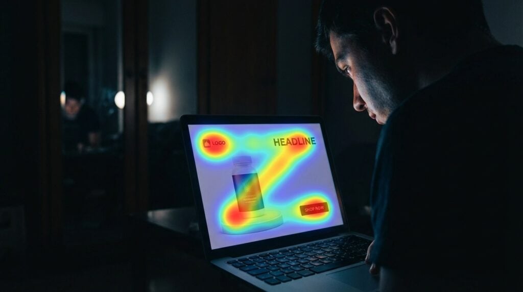 AI Generated by Shutterstock (Prompt: A photorealistic scene in a dark room where a person is viewing a digital advertisement on a laptop screen, bright screen glow illuminating the face, eye-tracking heatmap overlay forming a clear Z-pattern from top-left logo to top-right headline, diagonal focus to center image, ending at bottom-right call-to-action button, cinematic lighting, high contrast)