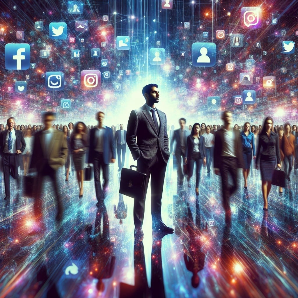 AI-Generated Image by Shutterstock (Prompt: create photography, personal branding concept, one business man stands out in the crowd, social media icon in the background, futuristic mood.)