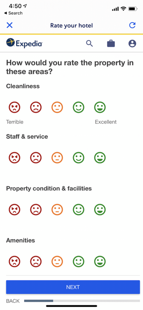 ยิ่งกับคนไทย อะไรที่ดูยากและยาวลูกค้าจะไม่อยากทำค่ะ เพราะฉะนั้นเราต้องหาเสิร์ฟของที่ย่อยง่ายใช้เวลาไม่นานลดอุปสรรคและพัฒนาวิธีการไปเรื่อย ๆ แต่ไม่หลุดจากข้อมูลที่ร้านต้องการ ตัวอย่างเช่นเว็บไซต์ Expedia สร้างแบบฟอร์มที่ให้ลูกค้ามีตัวเลือกในการให้คะแนนส่วนต่าง ๆ จากประสบการณ์ ง่ายมากแค่กดที่ไอคอนแสดงอารมณ์เขียวถึงแดง ทำให้ใช้เวลาเพียงไม่กี่คลิกก็สามารถในการให้คะแนนและวิจารณ์แง่มุมต่างๆ ของการเดินทางอย่างที่แพลตฟอร์มต้องการแล้ว