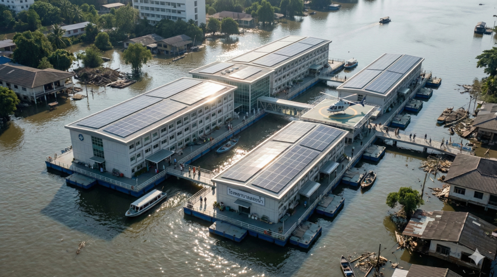 กลับมาที่เทรนด์หลักอันนี้ ในประเทศบังกลาเทศมีการสร้างโรงพยาบาลสำหรับแม่และเด็กที่ทนทานต่อมรสุมน้ำท่วมทั้งหลาย ไม่ใช่แค่ก่ออิฐฉาบปูนให้แข็งแรงเท่านั้น แต่เป็นการสร้างทั้งโรงพยาบาลให้อยู่บนแท่นที่สามารถยกสูงลอยอยู่บนน้ำได้ ทำให้เมื่อน้ำท่วมมาโรงพยาบาลก็ไม่จบ อารมณ์เหมือนพวกโป๊ะท่าเรืออะไรอย่างนั้นครับ