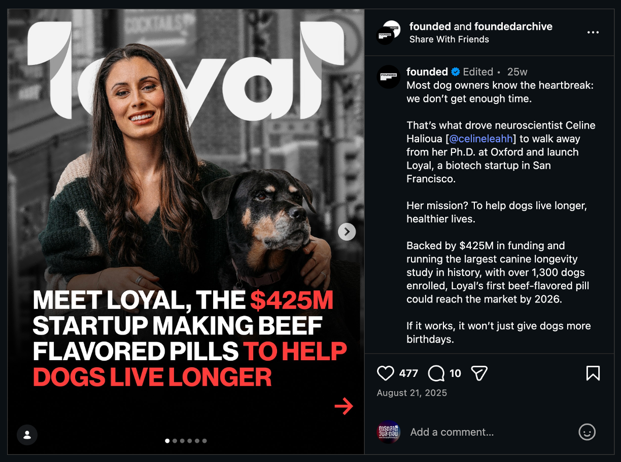 จากอาหารสัตว์สู่อาหารเสริม เริ่มมีบริษัทสตาร์ทอัพด้าน Longevity และนักลงทุนมาทำสินค้ากลุ่มนี้มากขึ้นในปีที่ผ่านมา เน้นการยืดอายุขับของสัตว์เลี้ยงโดยเฉพาะในกลุ่มสุนัขสูงวัย และสุนัขตัวใหญ่ที่มีโอกาสเจ็บป่วยง่าย และในปีนี้ก็จะมียาอายุวัฒนะของสุนัขเปิดตัวครั้งแรกจากเงินลงทุนกว่า 150 ล้านดอลลาร์ หรือคิดเป็นเงินไทยก็เกือบๆ ห้าพันล้านบาทครับ