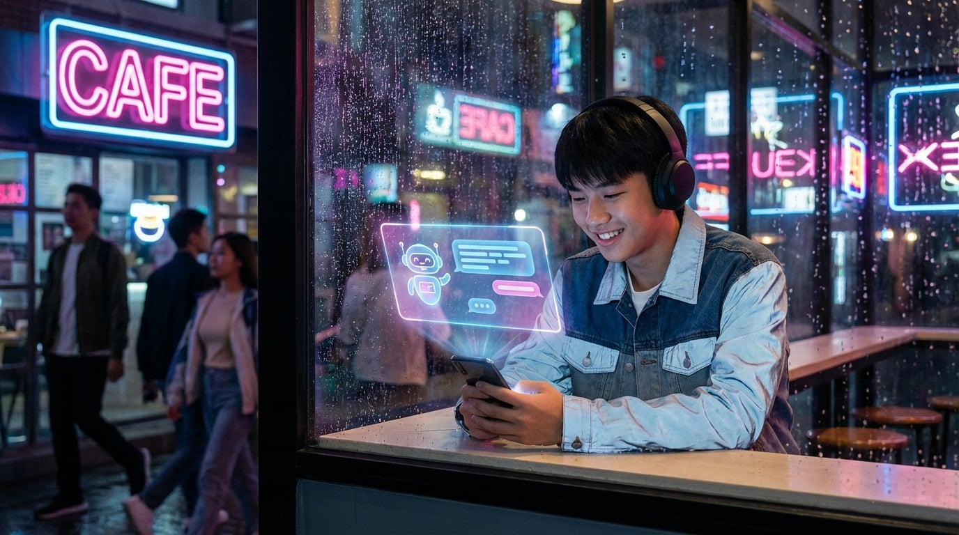 ขอบคุณภาพจาก Shutterstock AI Generator Prompt :In a bustling urban night café, a young Asian teenage boy with an infectious smile and sleek black over-ear headphones immerses himself in a vivid smartphone screen. The vibrant glow of a holographic interface, washed in ethereal blue and pink, dances above the device, showcasing a futuristic chat with an endearing robotic AI. Clad in a laid-back, two-tone jacket, he sits amidst blurred silhouettes of patrons and neon illuminations, including a striking pink ‘CAFE.’ His face gleams with a symphony of neon hues and holographic light. The scene captures the intimate vibrancy of a cyberpunk-lite lifestyle with exquisite, cinematic clarity.