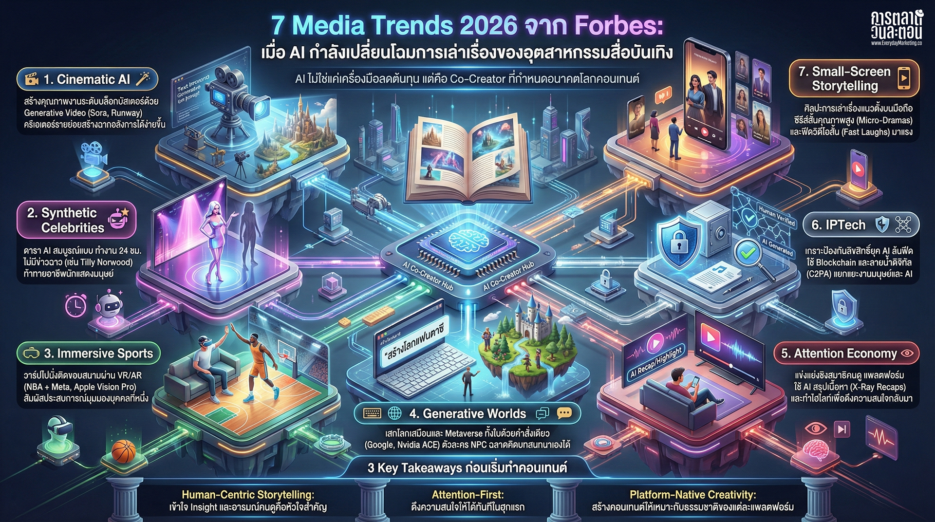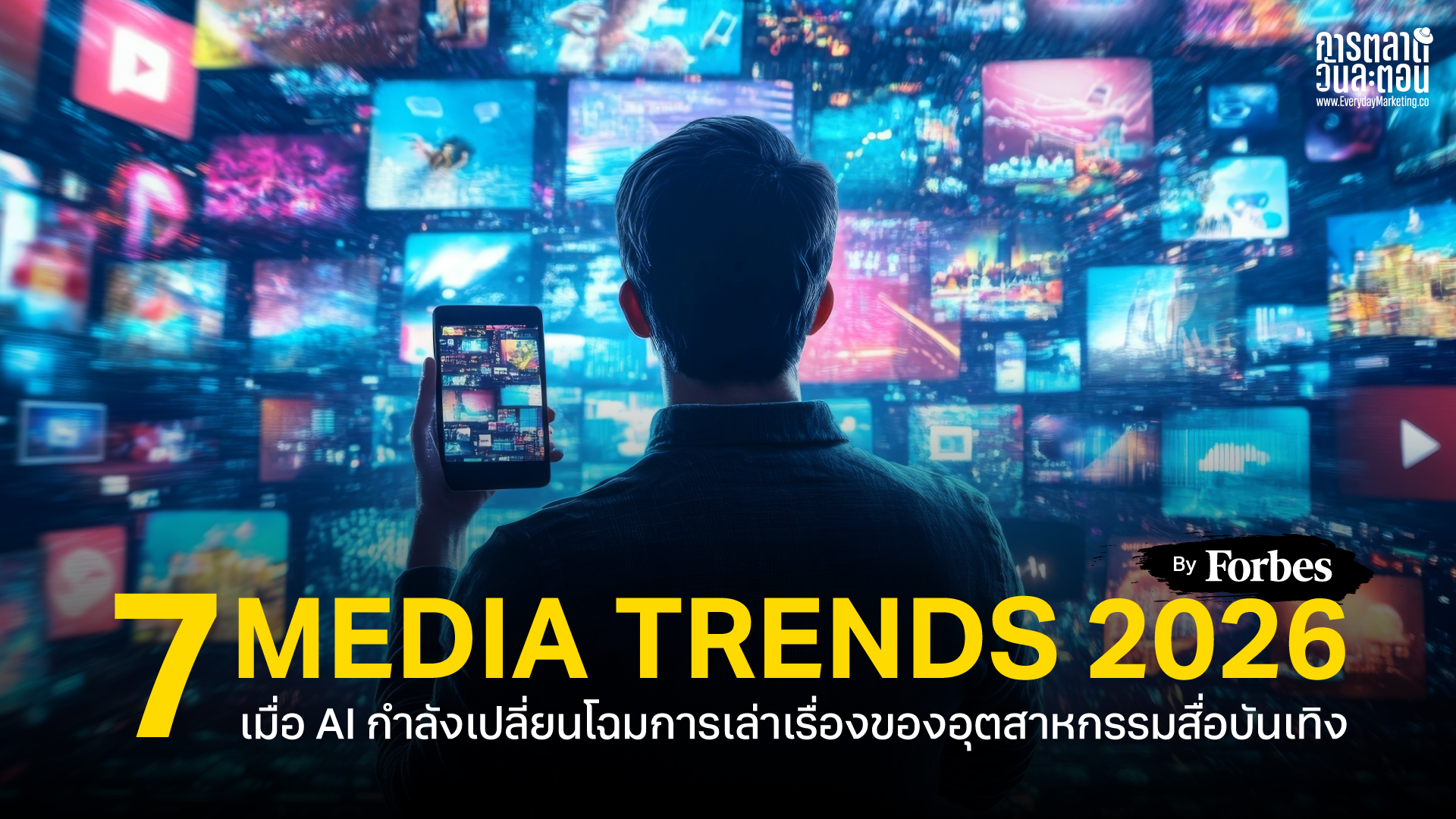 บทความนี้ผมอยากพาเพื่อนๆ มาดู 7 Media Trends 2026 จากรายงานของ Forbe ที่กำลังกำหนดทิศทางใหม่ให้โลกคอนเทนต์ ซึ่งไม่ใช่แค่เรื่องที่ควรรู้ แต่เป็นเรื่องที่ควรเตรียมตัวตั้งแต่วันนี้เป็นต้นไปครับ เพราะถ้าลองย้อนประวัติศาสตร์ของเทคโนโลยีหรือนวัตกรรมอะไรต่างๆ ให้ดี ก็จะพบว่าหลายๆ อย่างที่เปลี่ยนโลก ไม่ได้เริ่มจากอะไรซับซ้อนอะไรเลยครับ แต่เริ่มจากความบันเทิงที่เราตื่นมาดูทีวีก่อนไปโรงเรียน หรือโตขึ้นหน่อยก็เปิด Netflix ดูตอนกินข้าวหลังเลิกงาน จากวันที่ภาพยนตร์ทำให้คนเชื่อว่าภาพเล่าเรื่องได้ วันที่โทรทัศน์เปลี่ยนพฤติกรรมการใช้เวลาของคนในครอบครัว ไปจนถึงวันที่สตรีมมิงแพลตฟอร์มเปลี่ยนพฤติกรรมการดูหนัง
