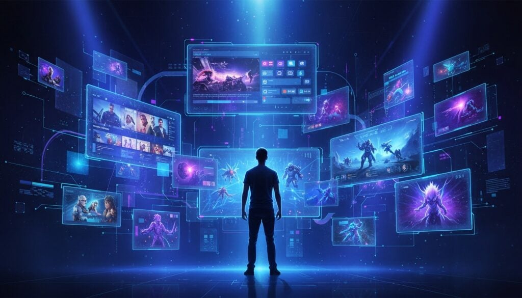 AI Generated by Shutterstock (Prompt: Back view of a man standing in front of a futuristic digital interface, connecting to cyberspace and online entertainment world, holographic screens showing streaming videos, social media feeds, gaming scenes, and AI-generated characters floating around, animated data streams and light trails, cinematic lighting, blue and purple color palette, realistic human silhouette, concept of AI transforming media and storytelling, modern technology meets entertainment industry)