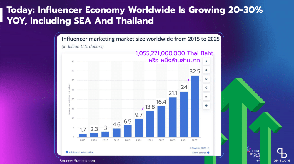 งาน Thailand Influencer Awards 2025 by Tellscore ก็เป็นอีกหนึ่งเวทีที่สะท้อนชัดเลยว่า อุตสาหกรรมนี้ยังโตต่อเนื่องไม่หยุด จากมูลค่าตลาดทั่วโลกที่ทะยานแตะกว่า 32,500 ล้านดอลลาร์สหรัฐ หรือราว 1.05 ล้านล้านบาท (Statista, 2025) และยังมีแนวโน้มโตขึ้นทุกปี เพราะ “ครีเอเตอร์” วันนี้ไม่ได้อยู่แค่บนหน้าจอ แต่กำลังกลายเป็นพลังทางเศรษฐกิจและสังคมระดับภูมิภาคจริง ๆ