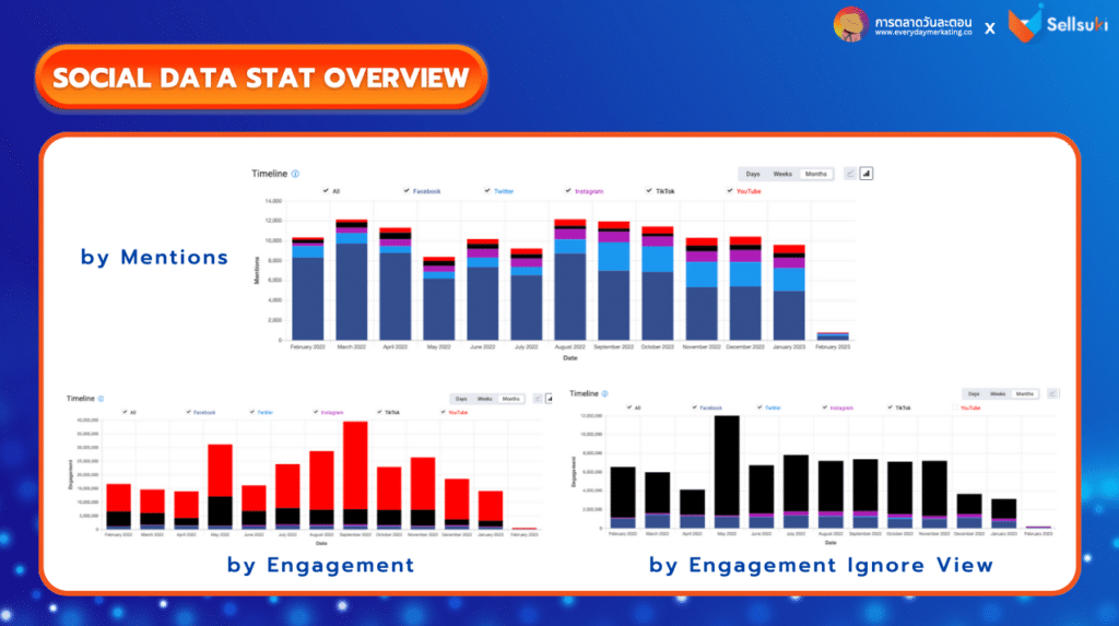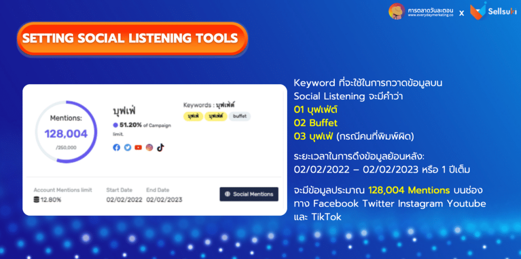 ซึ่งกำหนดระยะเวลาดึงข้อมูลย้อนหลังที่ : 02/02/2022 – 02/02/2023 หรือ 1 ปีเต็ม มีข้อมูลประมาณ 128,004 Mention บนช่องทาง Facebook Twitter Instagram Youtube และ TikTok