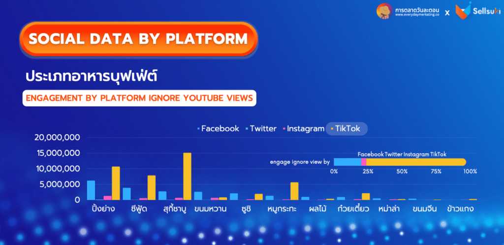 Engagement By Platform เลือกดูแบบ Ignore YouTube view ออกเพราะติดไบแอสยอดวิวจนกินพื้นพี่แพลตฟอร์มอื่น ๆ เหลืออันดับสูงสุดคือ TikTok ที่เหมาะกับคลิป สุกี้ชาบูมากที่สุด ตามมาด้วยปิ้งย่าง ซีฟู้ด หมูกระทะ ก๋วยเตี๋ยว และซูชิ