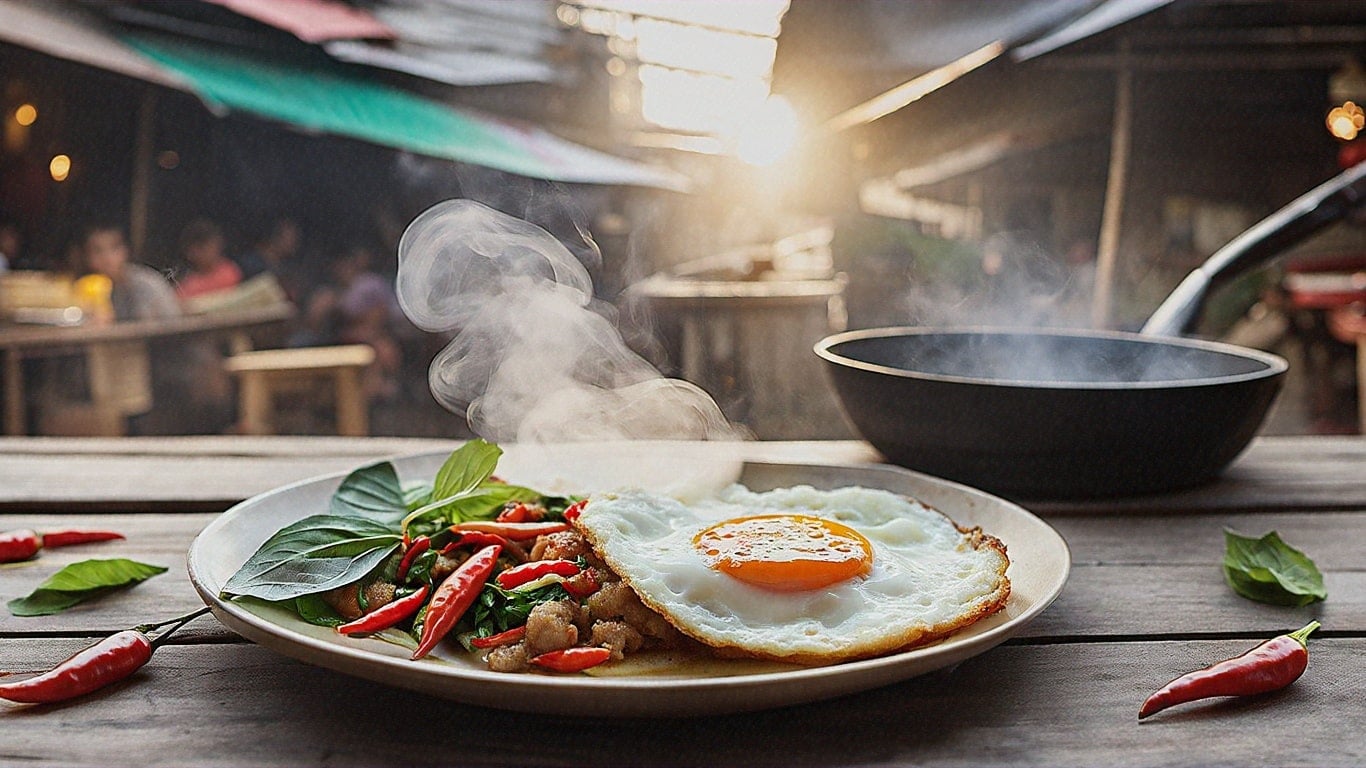 (AI-Generated Image by Shutterstock Prompt: A cinematic photograph of a traditional Thai dish “Pad Kra Pao” served on a rustic wooden table, vibrant basil leaves, red chilies, and a perfectly fried egg on top, steam rising in soft golden light, a background of Thai street food stalls)