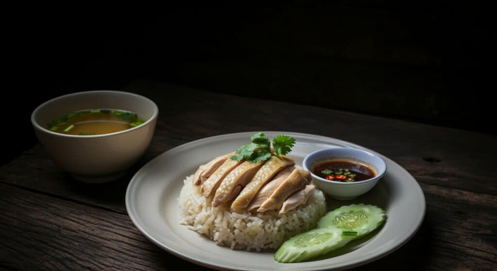 (AI-Generated Image by Shutterstock Prompt: A cinematic photograph of “Khao Man Gai,” a classic Thai chicken rice dish, tender chicken slices arranged on fragrant jasmine rice, served with a bowl of clear soup and a small dish of savory sauce, soft light illuminating the dish, rustic wooden table setting)