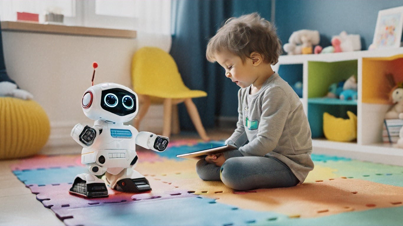 AI-Generated by Shutterstock (Prompt: a curious child interacting with an educational robot toy on a colorful playmat, smart tablet nearby displaying learning games, room filled with soft ambient light and tech-themed decor, futuristic yet playful atmosphere)