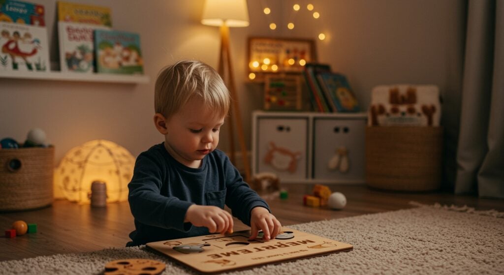 AI-Generated by Shutterstock (Prompt: a child playing with a personalized wooden puzzle engraved with their name, cozy playroom with warm lighting, soft textures, educational books and toys arranged neatly, cinematic depth of field, nurturing atmosphere)