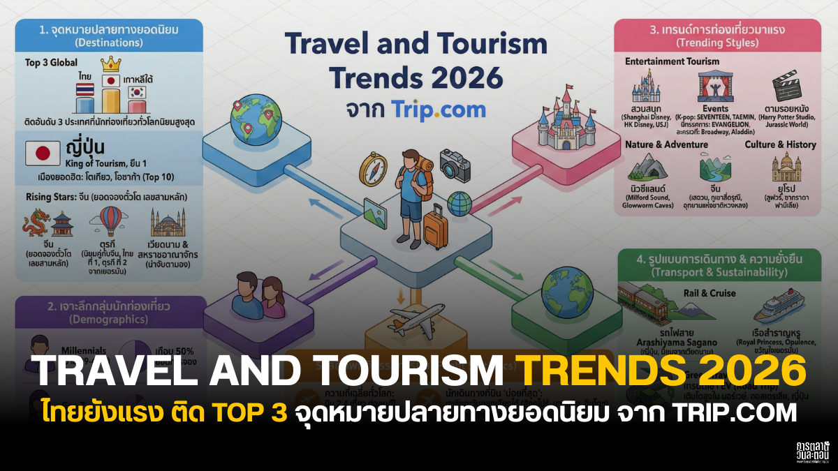 บทความนี้จะพาไปเจาะลึกทิศทางการท่องเที่ยวโลก Travel and Tourism Trends 2026 จาก Trip.com เปิดเทรนด์การท่องเที่ยวปี 2026 ที่สะท้อนให้เห็นถึงพฤติกรรมและปัจจัยสำคัญที่มีอิทธิพลต่อการตัดสินใจของนักเดินทางทั่วโลก ตั้งแต่การกลับมาครองแชมป์ของจุดหมายปลายทางยอดฮิตในเอเชีย การเติบโตของเทรนด์ท่องเที่ยวเชิงไลฟ์สไตล์ ไปจนถึงกระแสความยั่งยืนที่กำลังเปลี่ยนโฉมหน้าอุตสาหกรรมการท่องเที่ยว เพื่อให้คุณไม่พลาดทุกความเคลื่อนไหวที่น่าจับตามองในปีนี้ครับ