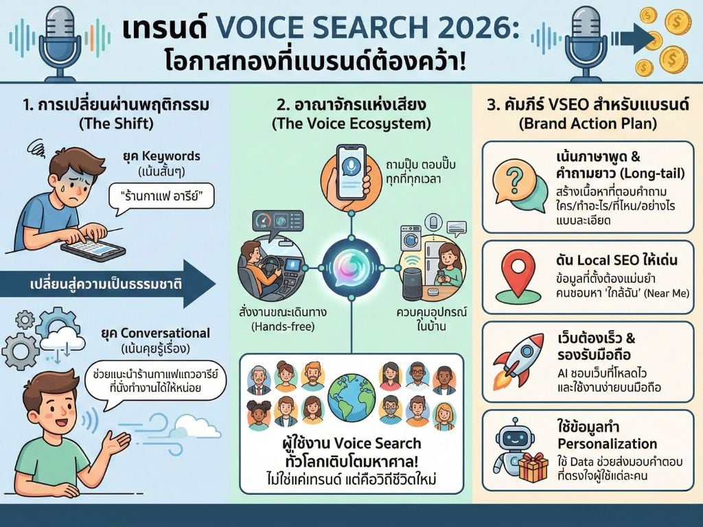 ดังนั้นถ้าแบรนด์อยากจะคว้าใจลูกค้ากลุ่มนี้ให้ทันโจทย์สำคัญคือต้องไวและตอบโจทย์ได้ทันที วันนี้เราเลยอยากชวนมาเจาะลึกเทรนด์ Voice Search ในปี 2026 กันค่ะว่ามีอะไรที่แบรนด์ต้องจับตามองเป็นพิเศษและทำไมมันถึงกลายเป็นกลยุทธ์สำคัญที่คุณจะมองข้ามไม่ได้อีกต่อไป