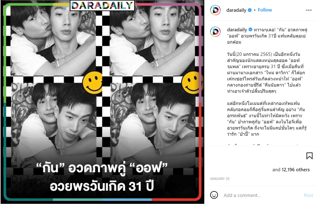 เป็นโพสต์ที่มี Engagement มากที่สุดบน Facebook นั่นคือคู่จิ้น บิวกิ้น พุฒิพงศ์ อัสสรัตนกุล และ พีพี กฤษฏ์ อำนวยเดชกร ที่ดังมาจากซีรีส์ชายรักชายหรือที่เรียกว่าซีรีส์วาย เรื่องแปลรักฉันด้วยใจเธอ จากนั้นพวกเขาทั้งคู่ก็ยังได้ร่วมงานด้วยกันอย่างต่อเนื่อง และแฟนคลับก็ตามจิ้นจนมาถึงทุกวันนี้ ซึ่งยังไม่มีท่าทีว่ากระแสของคู่นี้จะหายไป และปฏิเสธไม่ได้ว่าแฟนคลับของพวกเขายังเหนียวแน่นและพร้อมสนับสนุนพวกเขาอยู่เสมอมา