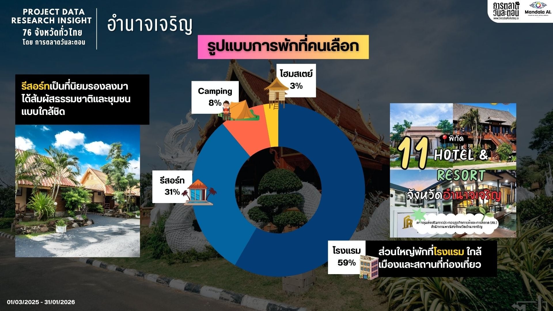 ตัวเลขเหล่านี้ชี้ให้เห็นอย่างชัดเจนว่า พฤติกรรมนักท่องเที่ยวในอำนาจเจริญเน้นความอิ่มใจจากการไหว้พระ เสริมด้วยความอิ่มท้องจากคาเฟ่และร้านอาหารในบรรยากาศที่เป็นกันเอง ทำให้อำนาจเจริญโดดเด่นในฐานะเมืองท่องเที่ยวเชิงพุทธศิลป์และไลฟ์สไตล์ที่สงบเงียบเป็นทริปที่ตอบโจทย์คนที่อยากหนีความวุ่นวายมาเติมพลังบวกอย่างแท้จริงค่ะ