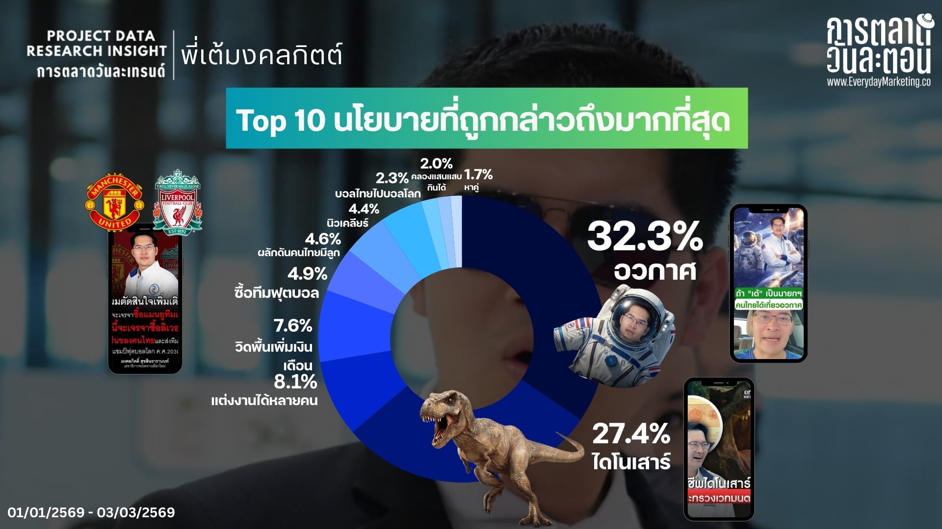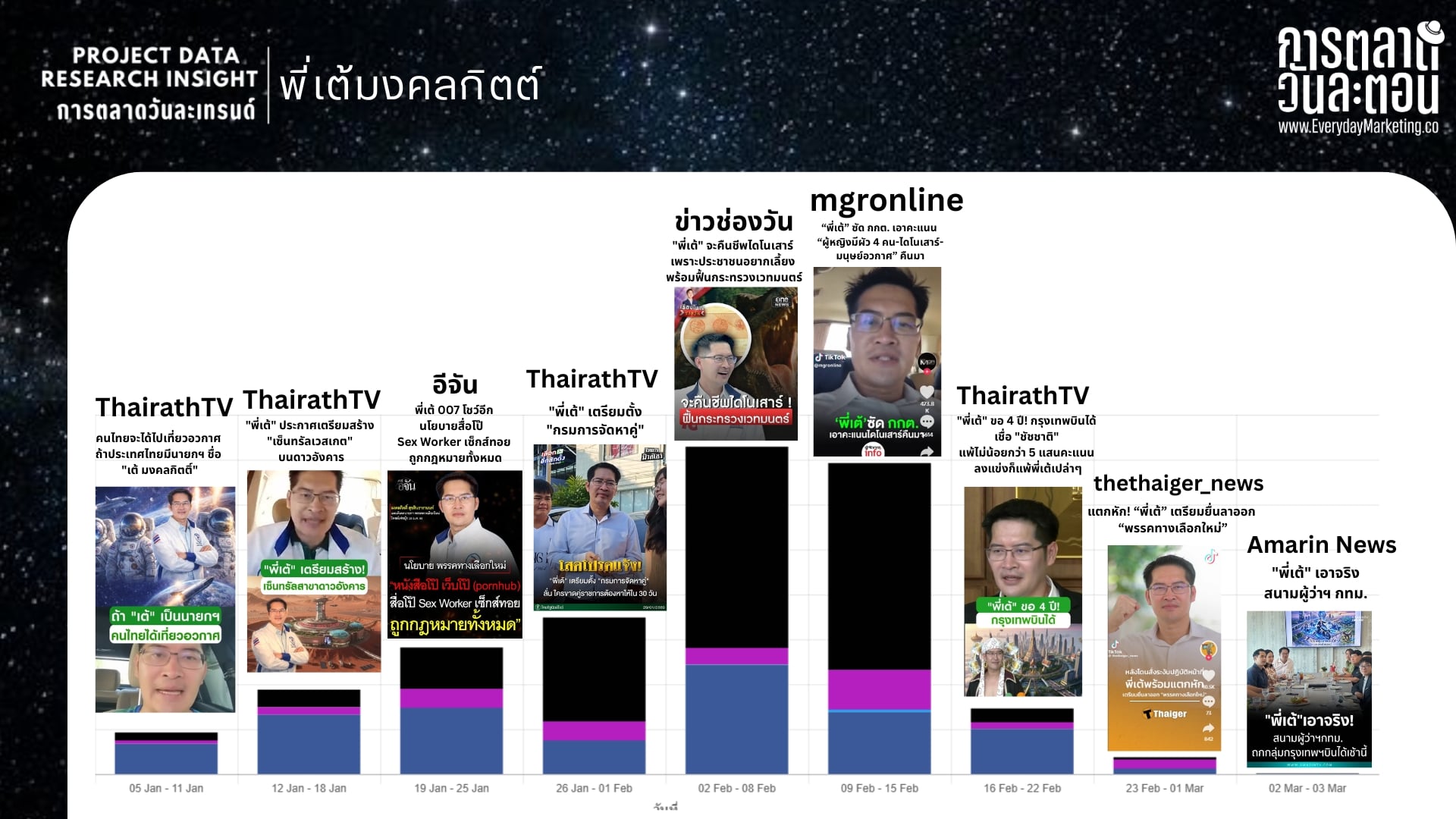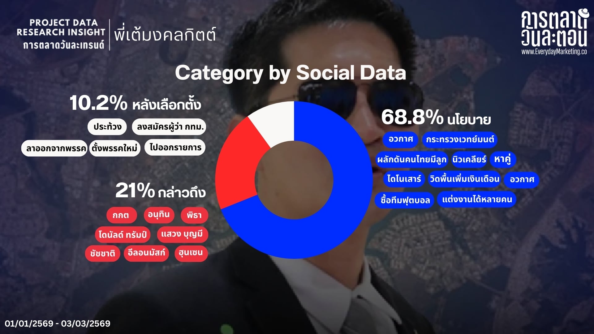 นโยบาย ถูกพูดถึงมากที่สุด 68.8% โดยมี อวกาศ ครองอันดับ 1 ด้วยสัดส่วน 32.3% ตามมาด้วย ไดโนเสาร์ 27.4% และ แต่งงานได้หลายคน 8.1% ซึ่งตอกย้ำว่าความแปลกใหม่และแฟนตาซีสุดล้ำเป็นจุดดึงดูดหลักในการสร้างกระแสไวรัล ส่วน บุคคลที่ถูกกล่าวถึงคู่กัน อยู่ที่ 21% โดย กกต ถูกพูดถึงมากที่สุด 53.23% ตามมาด้วย แสวง บุญมี 14.12% และ พิธา 7.97% แสดงให้เห็นถึงบทบาทของคู่กรณีทางการเมืองที่ช่วยเป็นตัวจุดชนวนความเดือดและขยายกระแสผ่านคาแรคเตอร์สายชนของพี่เต้ครับ