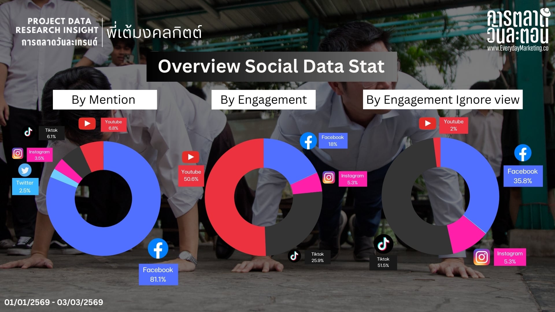 การมีส่วนร่วม (Engagement – Ignore View) เมื่อเราตัดยอดวิว YouTube ออกไปเพื่อดู การมีส่วนร่วมเชิงโต้ตอบจริง (Like, Share, Comment) จะพบภาพที่น่าสนใจมากขึ้นครับ