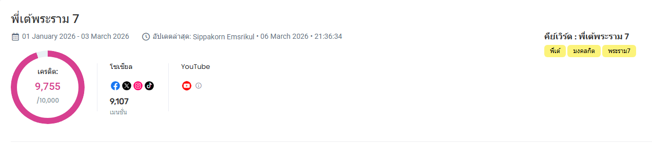 โดยตั้งค่าให้ Mandala ไปดึงข้อมูลย้อนหลังตั้งแต่ 1 มกราคม 2026 – 3 มีนาคม 2026 ครอบคลุมทุกแพลตฟอร์มใหญ่ ๆ ไม่ว่าจะเป็น Facebook, X (Twitter), Instagram, TikTok, และ YouTube ผลที่ได้คือมีข้อมูลรวม 10,000 mentions ซึ่งถือว่าเป็นกระแสที่ใหญ่มากสำหรับนักการเมืองครับ