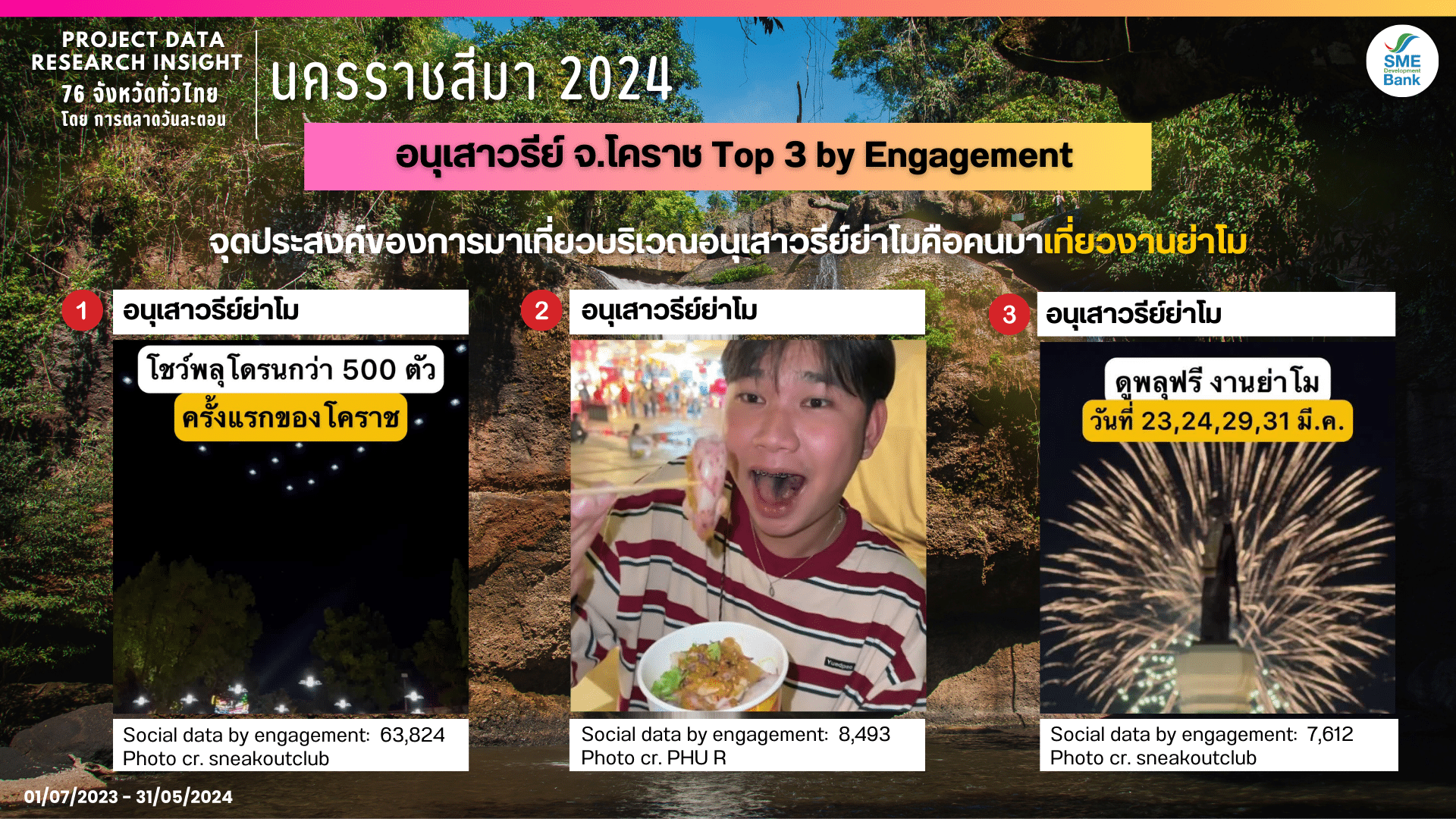 ตลอดปี 2023 และปี 2024 อนุเสาวรีย์ ที่ได้รับยอดเอนเกจสูงสุดสามอันดับมาจาก อนุสาวรีย์ท้าวสุรนารี หรืออนุเสาวรีย์ย่าโม เนื่องจากเป็นไทม์ไลน์ที่ตรงกับงานย่าโมและส่วนใหญ่มักไปเพื่อเที่ยวงานฉลองวันแห่งชัยชนะของท้าวสุรนารี (งานย่าโม) โดยในปีนี้จะเด่นเรื่องพลุและการตะลุยกิน