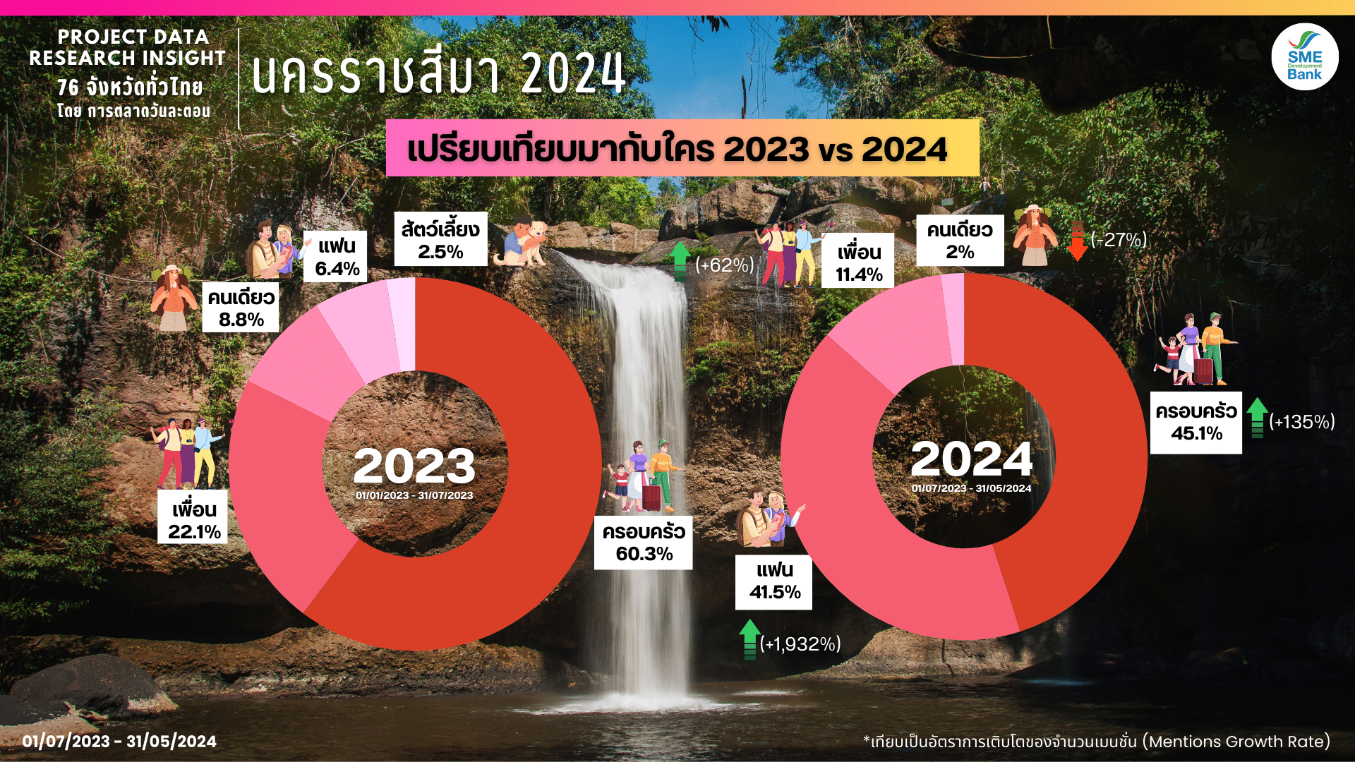 ถึงแม้ว่าในปี 2024 นี้ครอบครัวจะยังคงเป็นอันดับหนึ่ง แต่เมื่อเรามาดูอัตราของการเติบโตควบคู่เข้าไปด้วยเราก็จะเห็นได้เลยว่า การมาเที่ยวโคราชกับแฟนในปีนี้มาแรงมากจริง ๆ เพราะมีอัตราการเติบโตด้านการถูกพูดถึงสูงถึง 1,932% กันเลยทีเดียวค่ะ เมื่อเทียบกับทางครอบครัวที่มีการเติบโตอยู่ที่ 135%