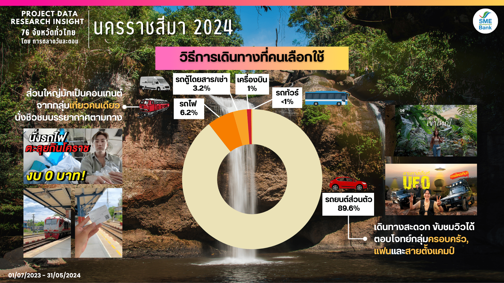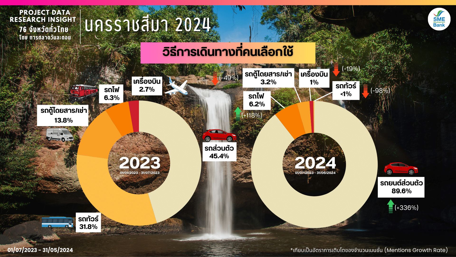 ข้อมูลของการเติบโตในแต่ละสัดส่วนยิ่งตอกย้ำไปอีกว่ารถเดินทางมาโคราชด้วยรถยนต์ส่วนตัวกันจริง ๆ โดยเพิ่มขึ้นสูงขึ้น 336% จากปี 2023 และรถไฟก็ยังคงมีอัตราการเติบโตที่น่าสนใจเช่นเดียวกัน อันเนื่องมาจากเทรนด์ส่วนหนึ่งของการท่องเที่ยวที่เน้นความเรียล เที่ยวคนเดียวแบบจอย ๆ หรือจะแบกเป้เที่ยวกันมากขึ้นในปัจจุบัน ส่วนรถตู้โดยสาร/เช่า เครื่องบิน รถทัวร์ ในปีนี้มีอัตราการเติบโตที่ลดลงจากปีที่แล้วค่ะ