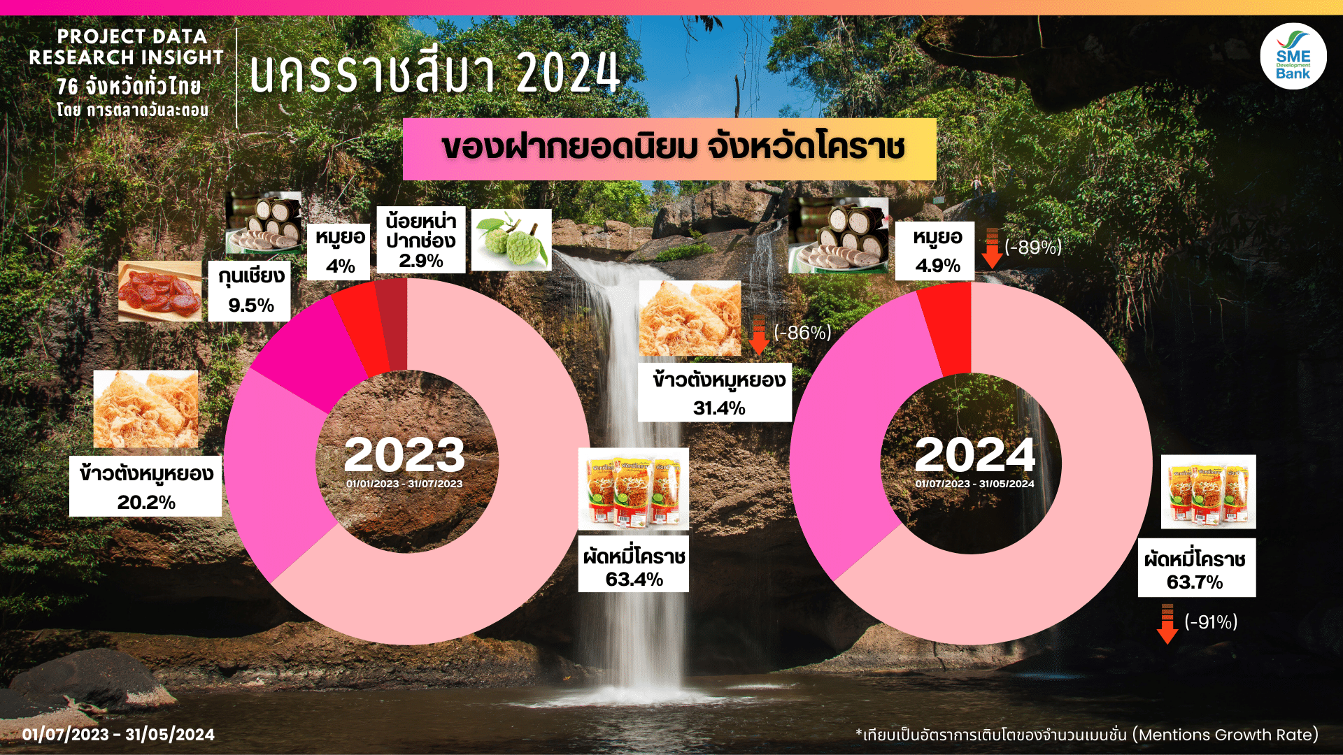 เมื่อนำมาเปรียบเทียบกับปี 2023 เราจะเห็นได้เลยว่าในปีนี้ มีเพียงของฝาก 3 อย่างเท่านั้นที่มีการถูกพูดถึงบน Social Media ทั้งนี้ของฝากทั้ง 3 อันดับมีอัตราการถูกพูดถึงที่ลดลงด้วยอย่างเห็นได้ชัด แสดงว่าความสนใจอาจลดลง ไม่แน่ว่าเทรนด์ของฝากจังหวัดโคราชในปีถัด ๆ ไปอาจมีการเปลี่ยนแปลงก็เป็นได้ค่ะ