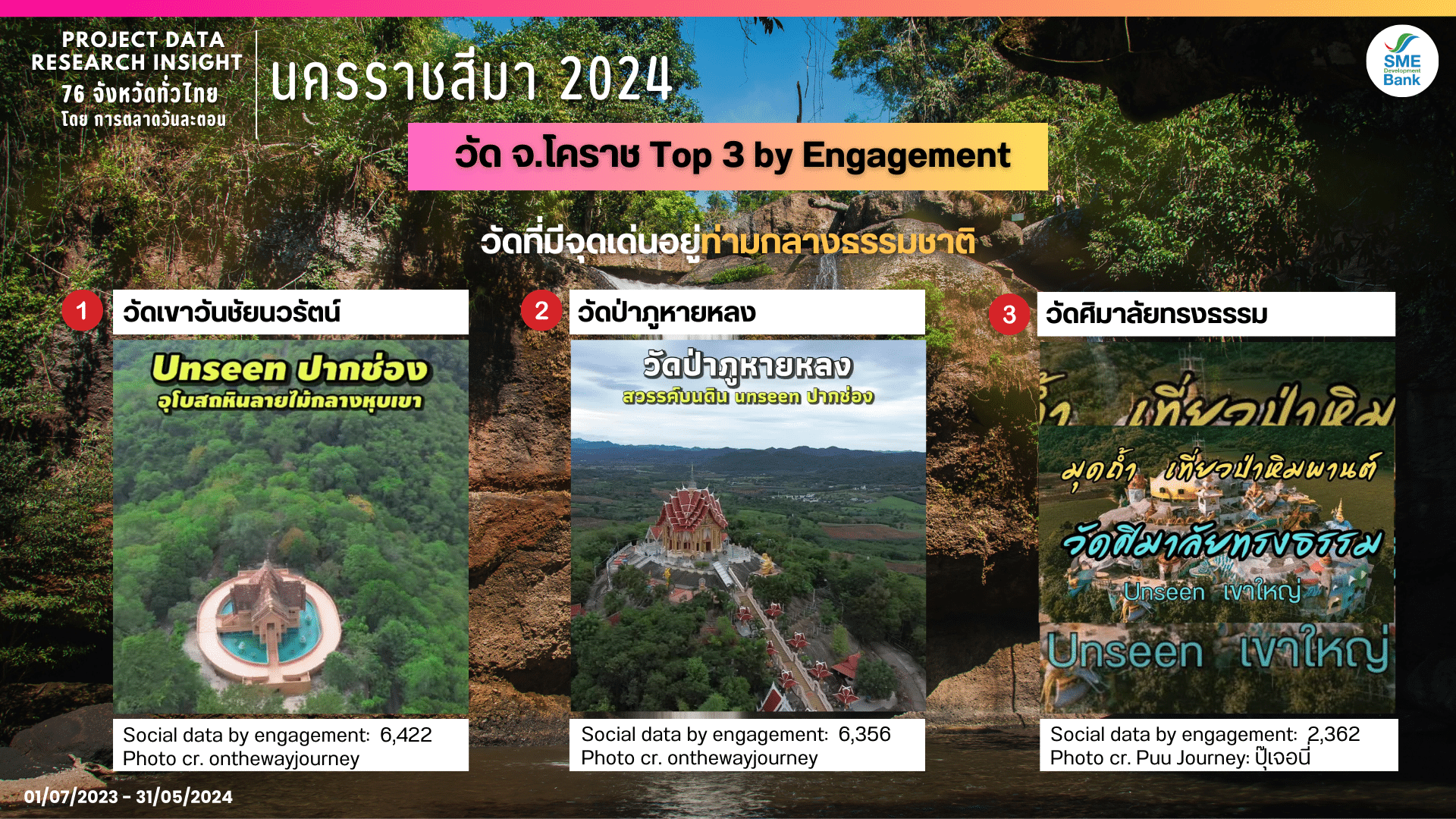 บริบทส่วนใหญ่จาก Social listening เราพบว่าวัดที่ได้รับความนิยมมักเป็นวัดที่มีจุดเด่นอยู่ท่ามกลางธรรมชาติ จาก Data สามารถขุด Insight วัด จ.โคราช Top 3 by Engagement ได้ดังนี้