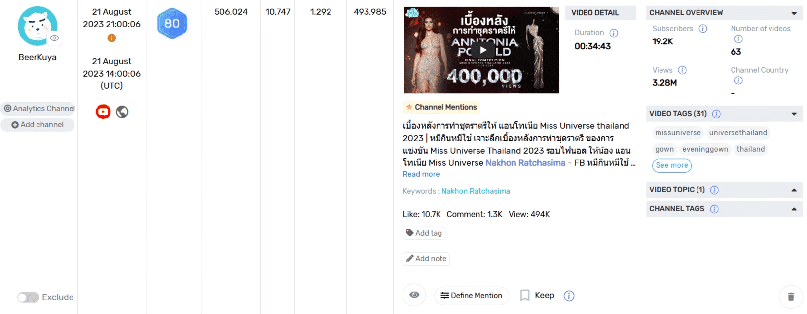 ยกตัวอย่างเช่น เบื้องหลังการทำชุดราตรีให้แอนโทเนีย Miss Universe Thailand ที่เป็นตัวแทนจากนครราชสีมา เราจะเห็นได้ว่าในโพสต์นี้มีคำว่า “Nakhon Ratchasima ” อยู่ในโพสต์ แต่บริบทของข้อความไม่ได้มีความเกี่ยวเนื่องกับหัวข้อที่เราต้องการ นั่นจึงเป็นเหตุผลที่ว่าทำไมเราถึงต้องคัดกรองข้อมูลก่อนนั่นเองค่ะ