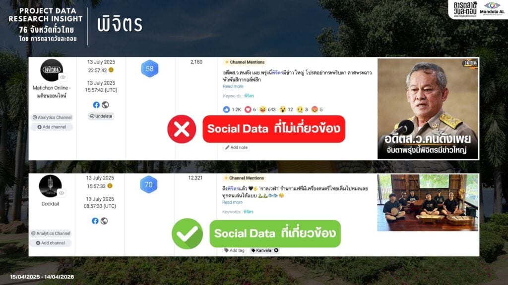 ยกตัวอย่างเช่น โพสต์ข่าวอาชญากรรม หรือเรื่องการเมือง ที่เราเห็นในภาพครับ ในโพสต์นี้มีการพูดถึง “พิจิตร” ก็จริง แต่บริบทของข้อความเป็นการพูดถึงเหตุการณ์ซึ่งไม่ได้มีความเกี่ยวเนื่องกับหัวข้อการท่องเที่ยวที่เราต้องการวิเคราะห์ นั่นจึงเป็นเหตุผลที่ว่าทำไมเราถึงต้องคัดกรองข้อมูล (Exclude) ที่ไม่เกี่ยวข้องเหล่านี้ออกไปก่อนนั่นเองครับ