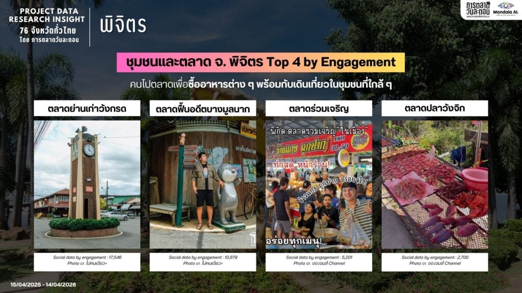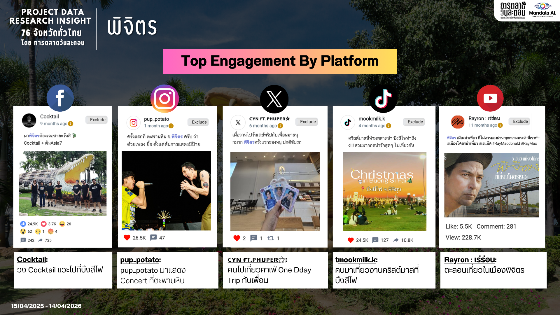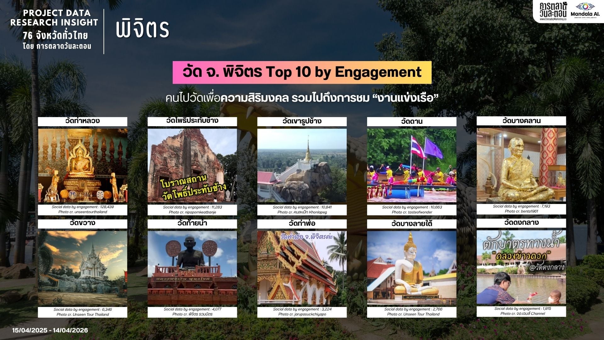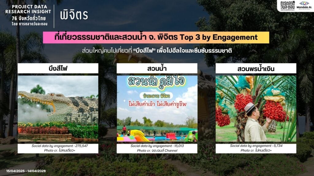 จากข้อมูลจะเห็นว่า บึงสีไฟ คือ “แม่เหล็ก” สำคัญที่สุดของจังหวัดพิจิตรในมิติของธรรมชาติครับ ด้วยยอด Engagement ที่สูงมาก ข้อมูลนี้สะท้อนให้เห็นเลยครับว่าเสน่ห์สำคัญของพิจิตรที่ดึงดูดนักท่องเที่ยว ก็คือพื้นที่พักผ่อนหย่อนใจขนาดใหญ่ที่เป็นเหมือนปอดของเมืองครับ