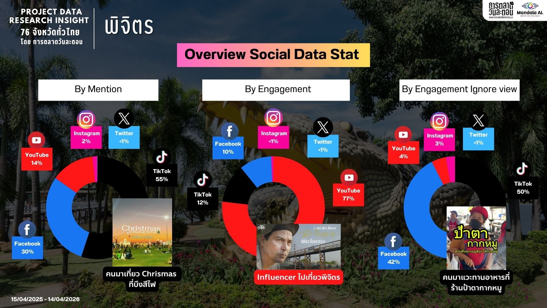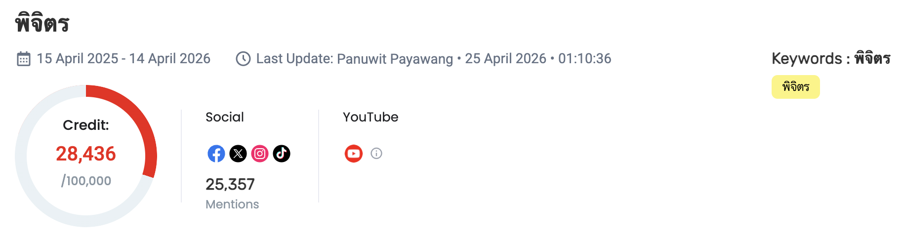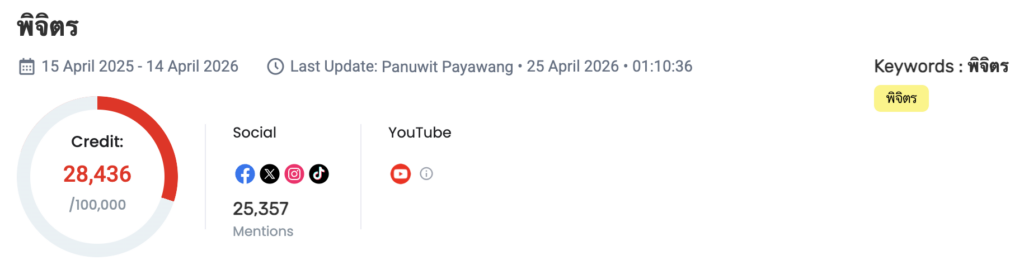 ตัว Keyword ที่ใช้คือ “พิจิตร” ระยะเวลาดึงข้อมูลย้อนหลัง 15 April 2025 – 14 April 2026 รวมทั้งสิ้น 1 ปี ย้อนหลังกับข้อมูลจํานวน 28,141 Mentions