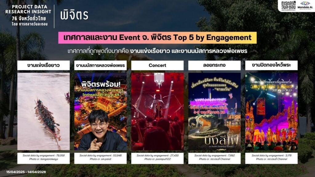 ลอยกระทง (7,692 Engagement): เทศกาลตามวิถีวัฒนธรรมริมน้ำที่คนนิยมมาร่วมสืบสานประเพณีตามจุดสำคัญต่าง ๆ ของจังหวัดพิจิตร