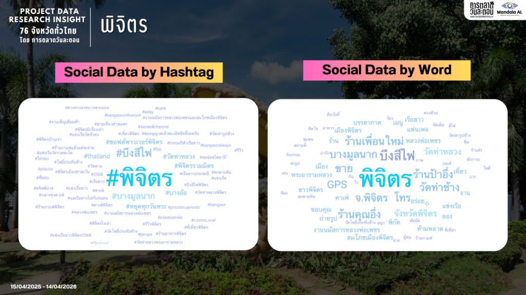 อันดับ 1 แน่นอนคือ #พิจิตร แต่ที่น่าสนใจคือคำที่รองลงมาครับ เราจะเห็นคำที่เกี่ยวกับสถานที่สำคัญอย่าง #บึงสีไฟ, #วัดท่าหลวง และเอกลักษณ์ของเมืองอย่าง #พิจิตรเมืองชาละวัน และที่สำคัญ เรายังเห็นการค้นหาหรือพูดถึง #ที่เที่ยวพิจิตร รวมถึง #คาเฟ่พิจิตร และ #รีวิวพิจิตร อย่างชัดเจน