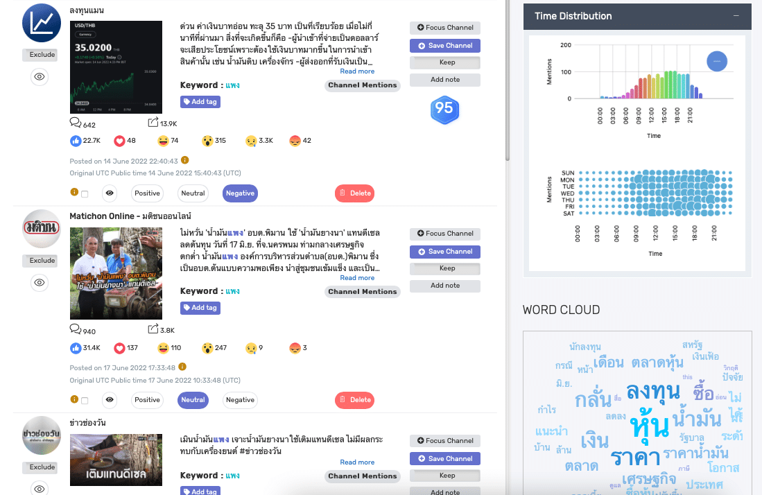 ปกติเราดูโดยรวมได้ดีอยู่แล้วนะคะ ในรูปถัดไปด้านล่าง แต่ในตัวอย่างคือจำกัดแค่เฉพาะวันนั้น คำว่าหุ้น ลงทุน ราคา น้ำมันขึ้นมาใหญ่มากเพราะมีเพจลงทุนแมนกล่าวถึง Keyword ที่เราจับ Social Data เข้ามานั่นเอง